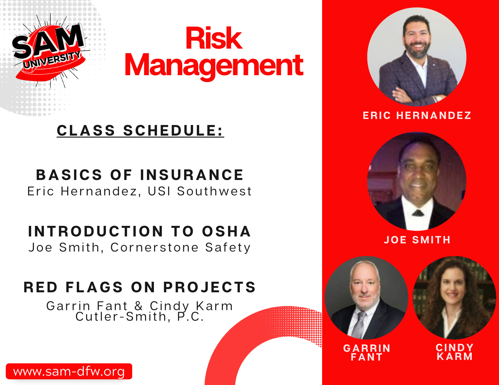 Welcome to Class 1 of 2024 SAM University. In this class, we will focus on Risk Management in Construction. We will cover the basics of Safety, Insurance, and some Legal items to keep in mind on your projects. Enroll for the single class or the full 2024 SAM University Program, which includes Classes 2 & 3 and the Completion Mixer. *Discounted Pricing for SAM Members*