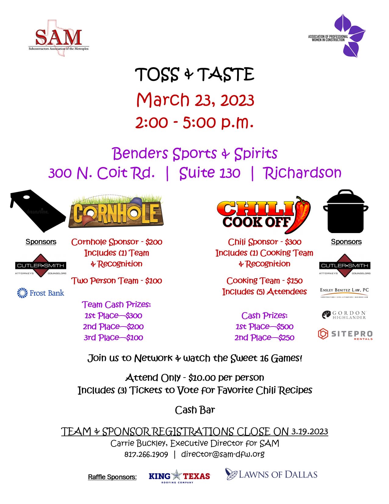 Join SAM and APWC for our Annual Toss & Taste! APWC is the Association of Professional Women in Construction, which is an association for women involved in the construction industry from general contractors, subcontractors, and supporting vendors. This come-and-go event is open to members and friends of both associations. Chili Tasting and Cornhole Tournament will begin at 2:00. Come on out to cast your (3) votes included with your registration. The Winners will be announced just before 5:00 p.m. Attend this event to taste some chili, cheer on your friends, network with new friends, and play in our Raffle! Buy 1 Raffle Ticket for $10.00 or Buy 6 Tickets for $50.00. *Membership in SAM and APWC is not required to attend this event. *Cash Bar available during Toss & Taste. Outside beverages are NOT allowed.